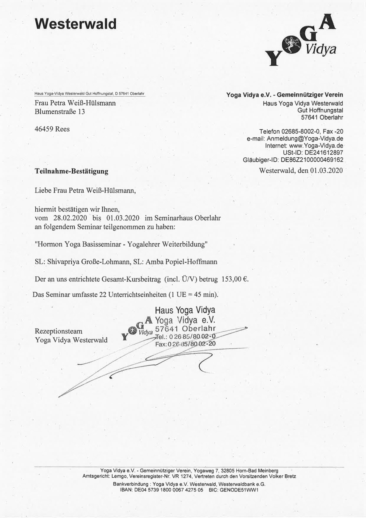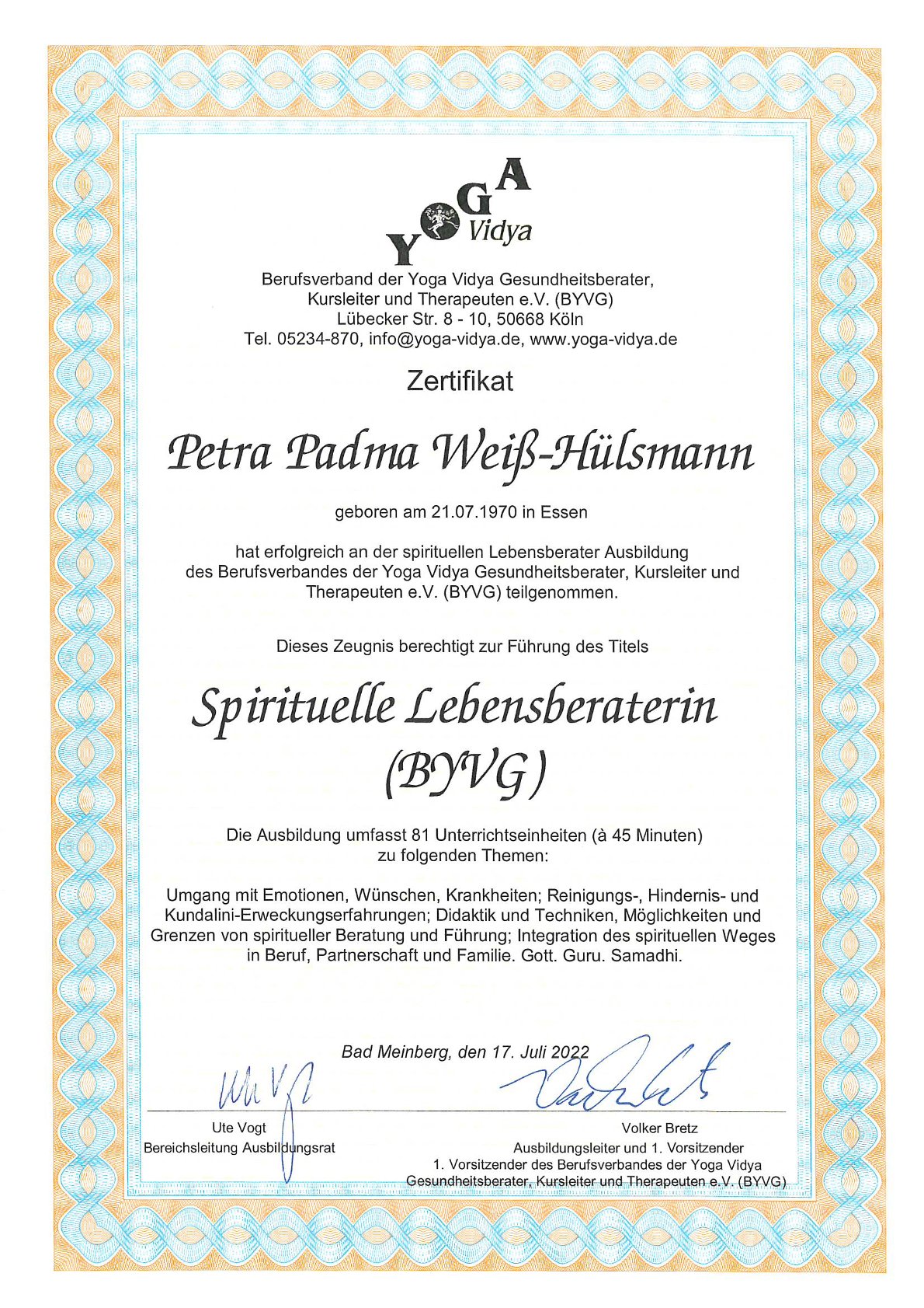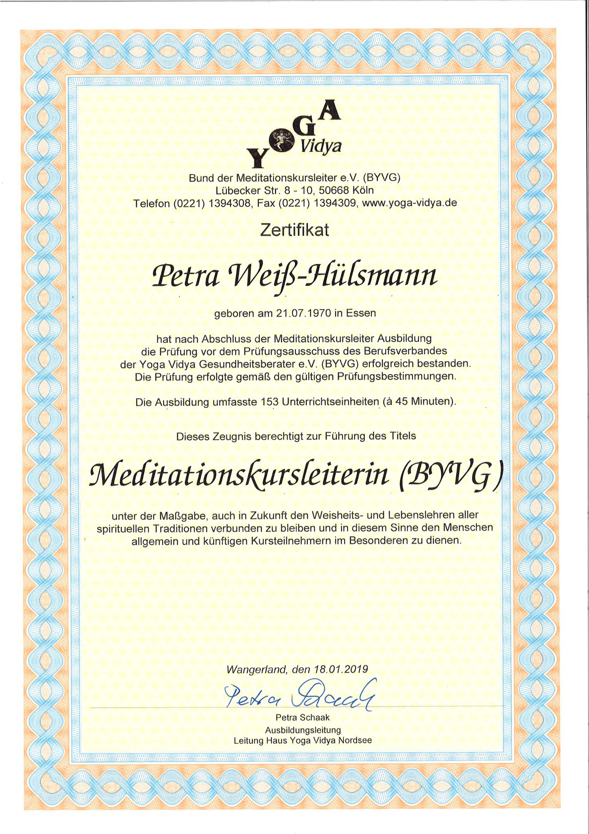 Zertifikate meiner Yoga- und Meditationslehrer-Ausbildung